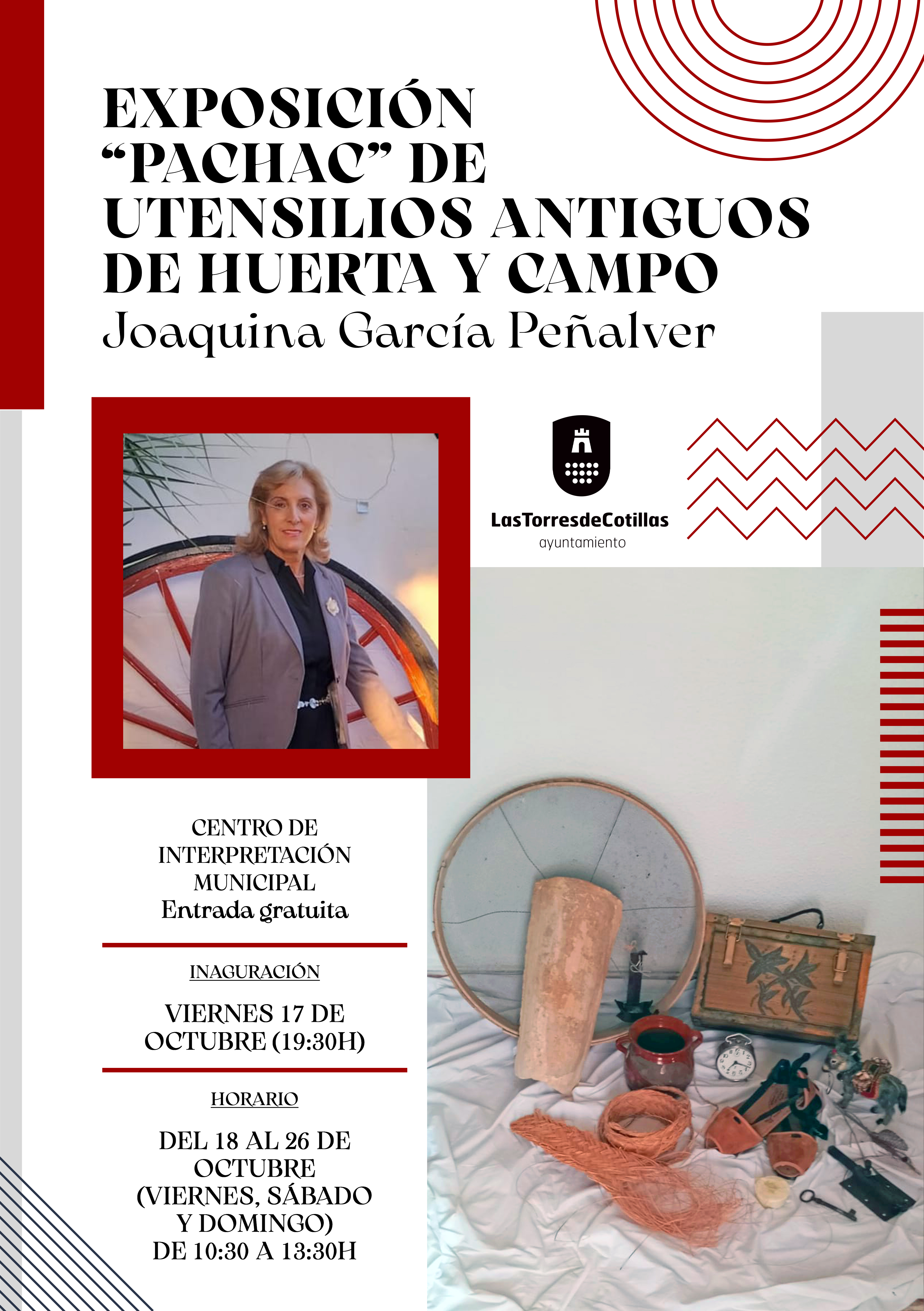 11/10/25 – El Centro de Interpretación Municipal será escenario de la exposición “Pachac”, una muestra de utensilios antiguos de huerta y campo recopilados por Joaquina García Peñalver. “La muestra reunirá una amplia selección de herramientas y objetos cotidianos que durante décadas formaron parte esencial de la vida murciana”, señala la concejala de Cultura, Gloria Fernández, cuya área organiza esta actividad.