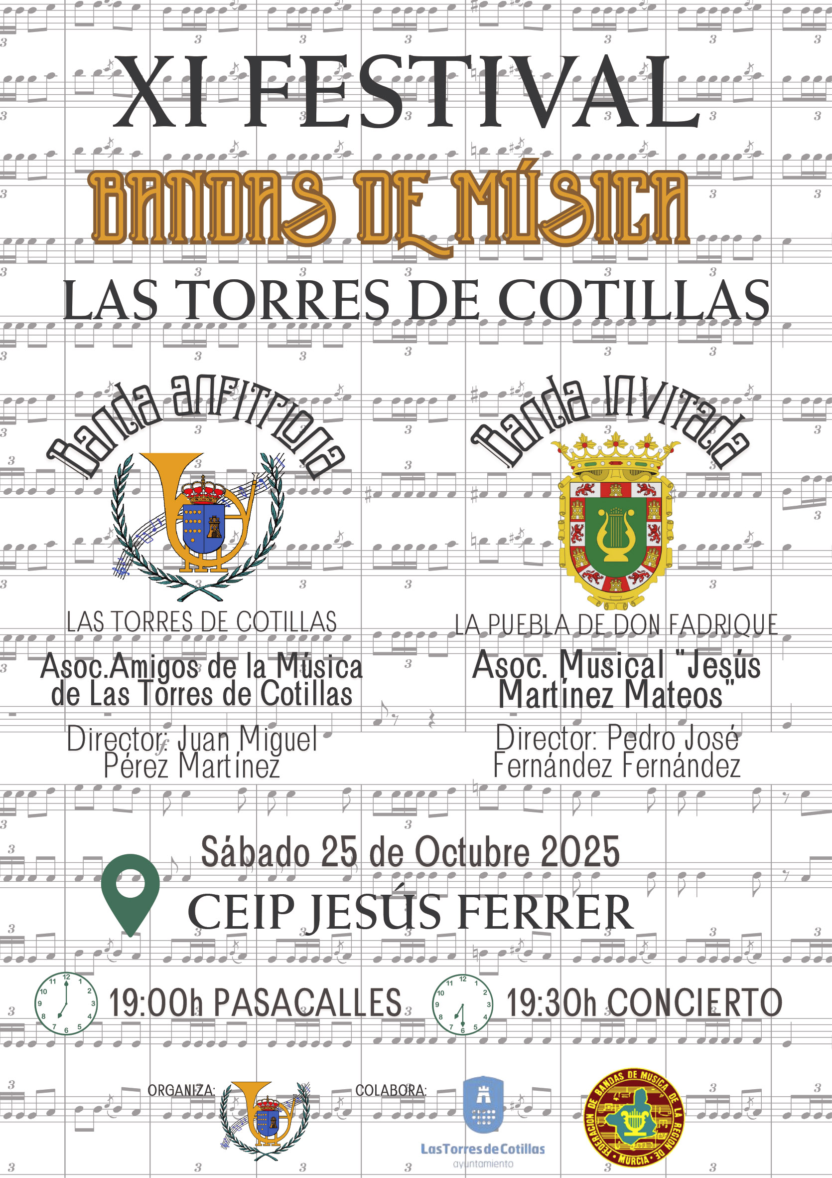 17/10/25 – Las Torres de Cotillas se prepara para disfrutar de una de sus citas culturales más populares: el Festival de Bandas de Música, que este año cumple su 11ª edición y se celebrará el sábado 25 de octubre en el colegio Jesús Ferrer.