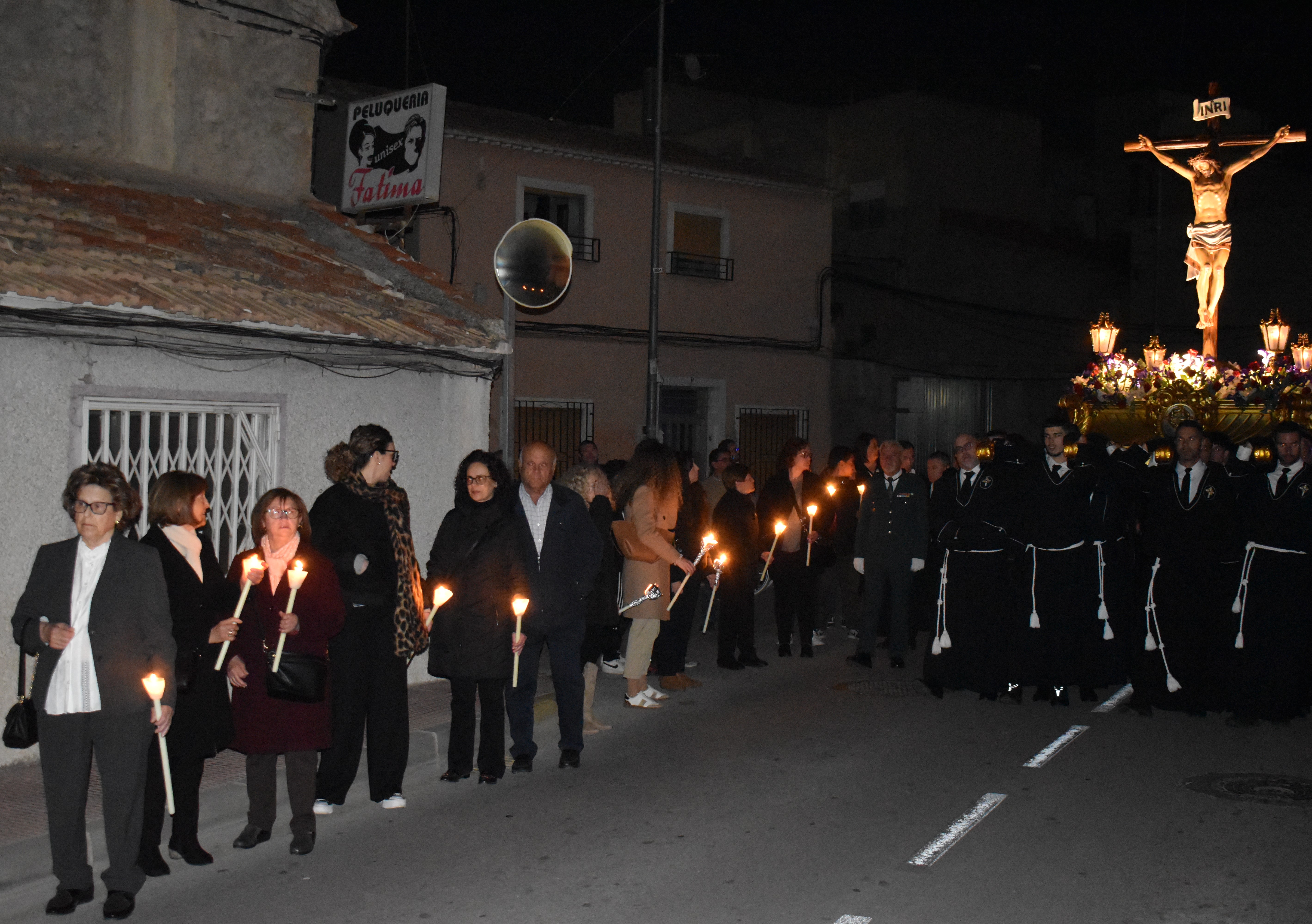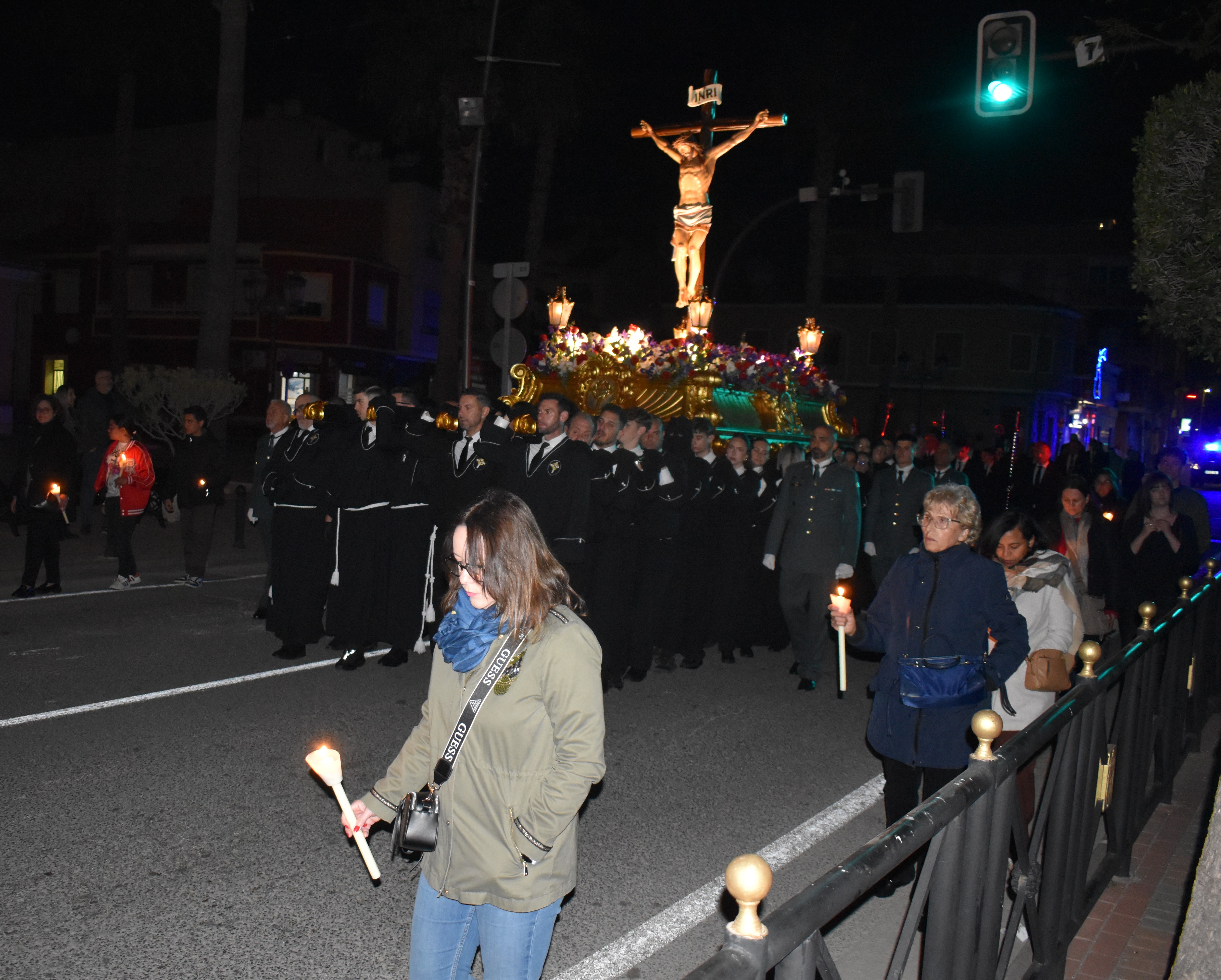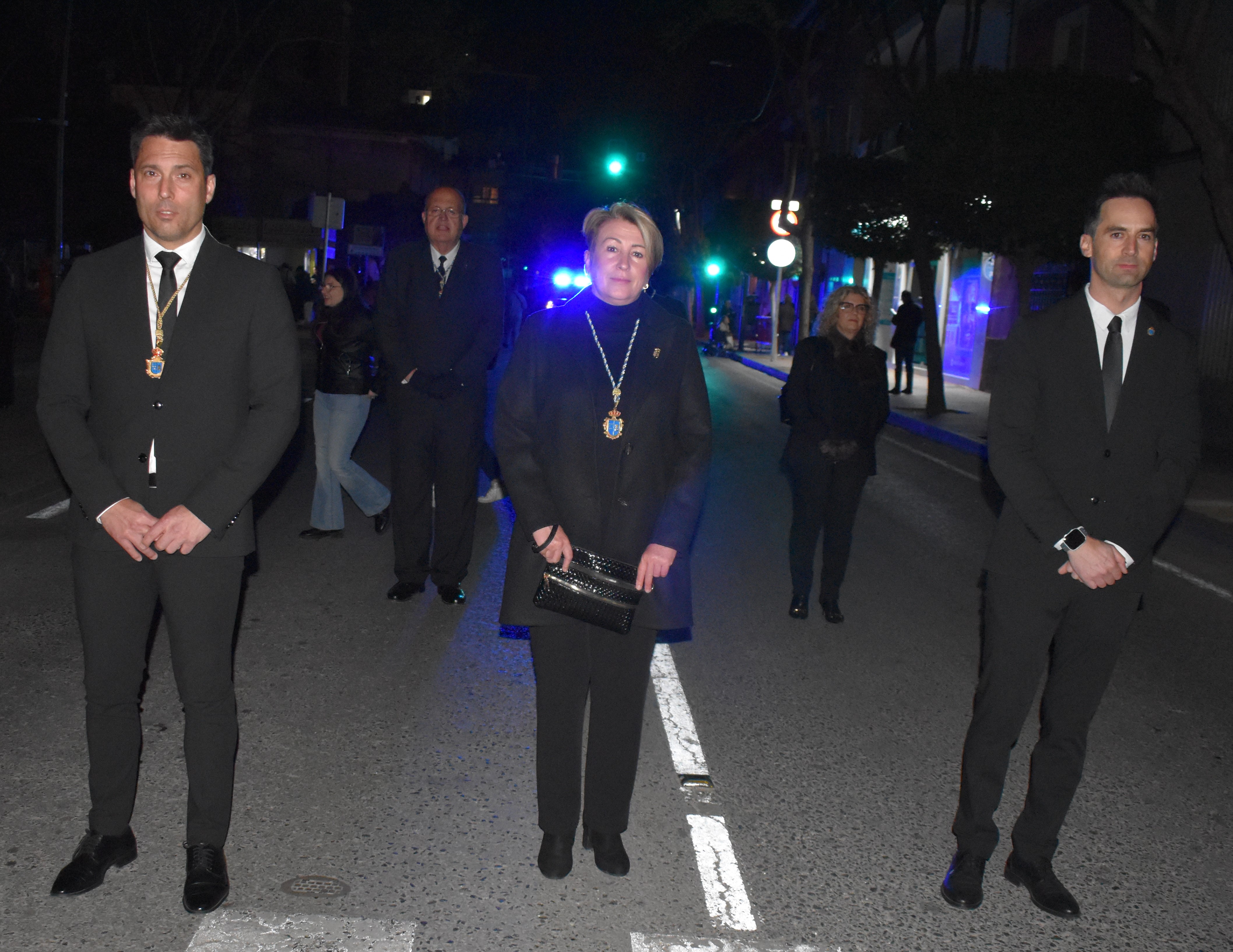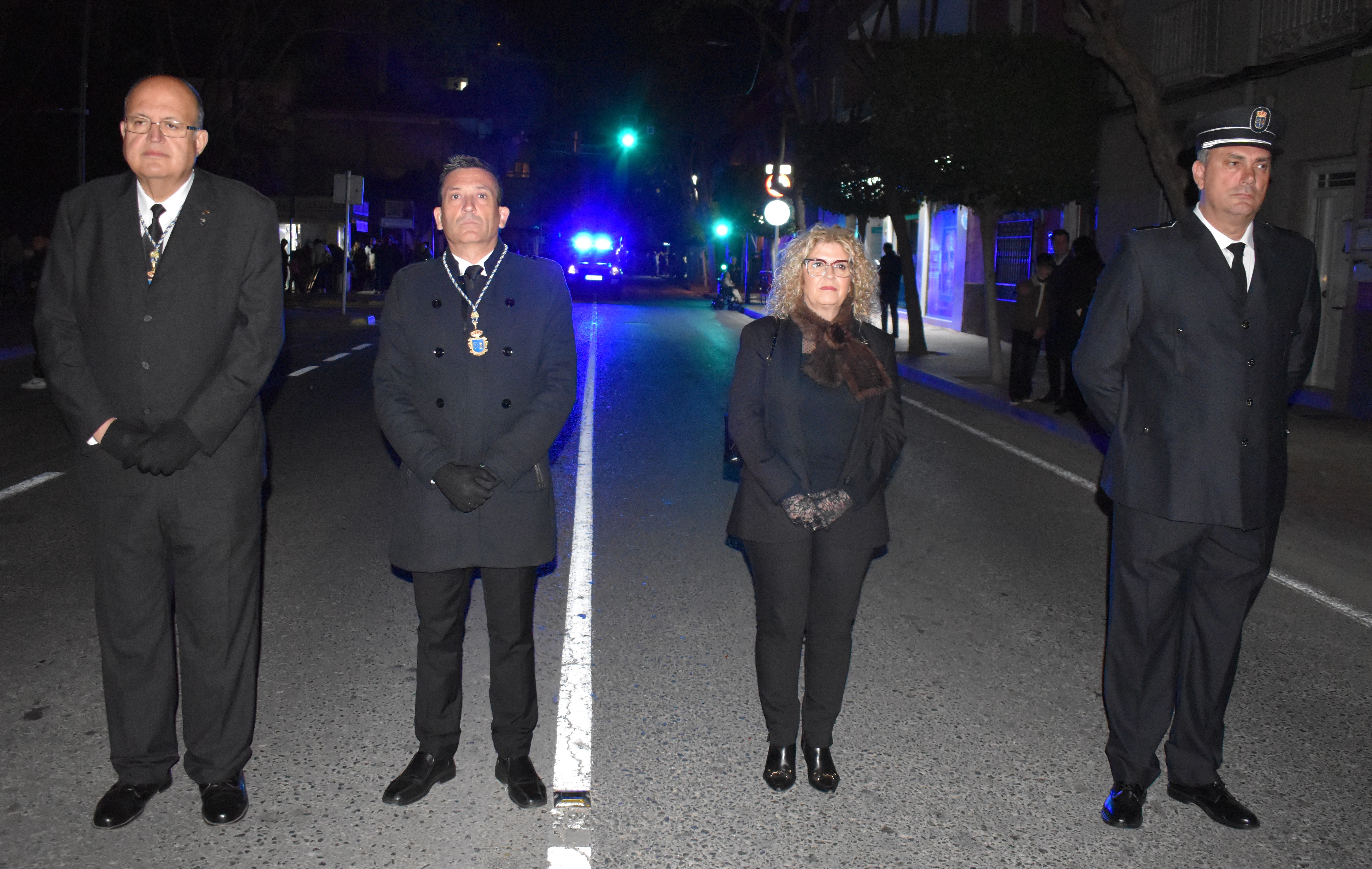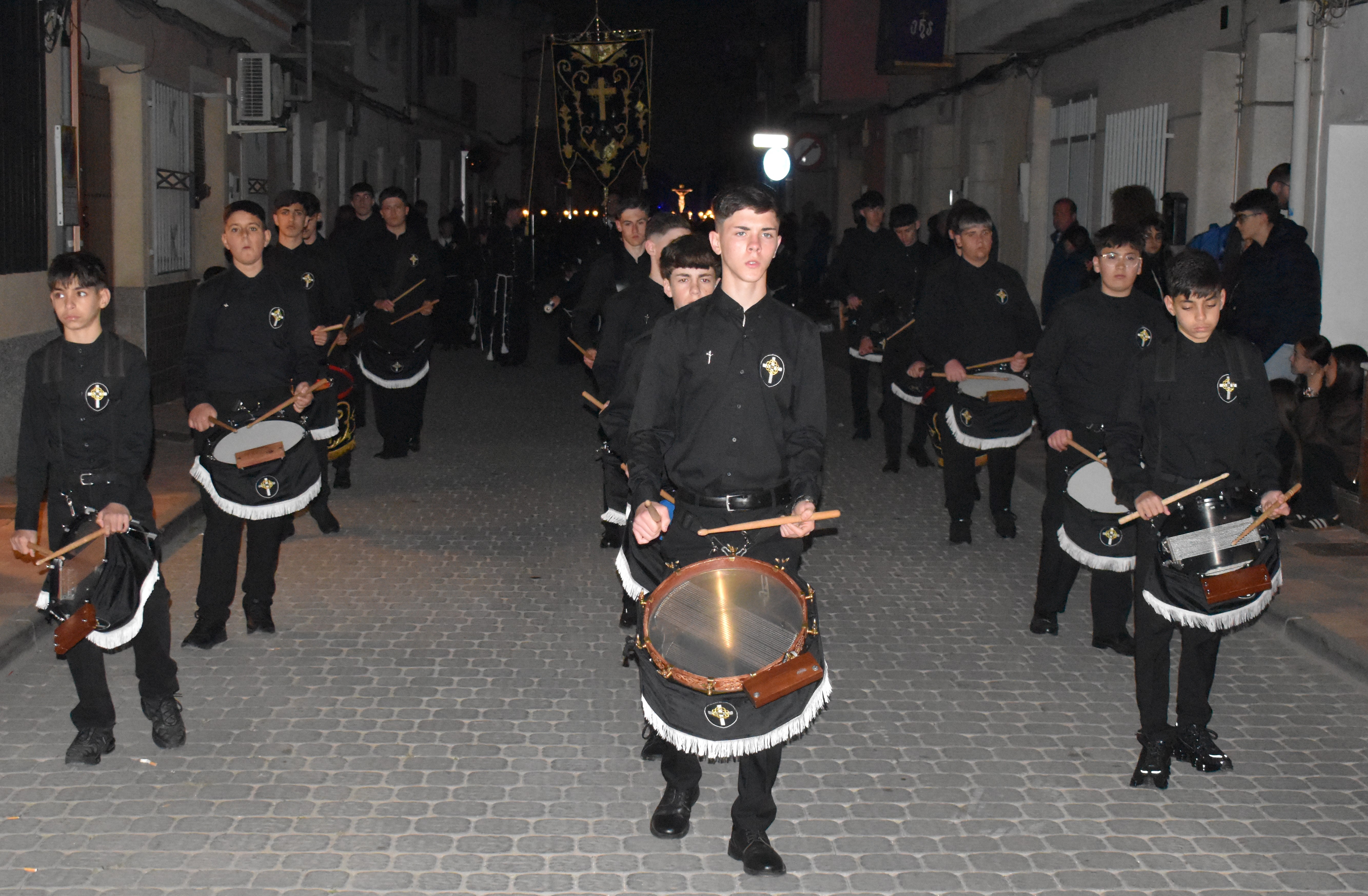 Como es tradición, a la salida de la procesión la campana de auroros Virgen del Rosario local rompió el silencio imperante para cantarle al Cristo. Después los ‘negros’ y los penitentes, al ritmo de la banda de la Cofradía, desfilaron sigilosamente por las calles torreñas.