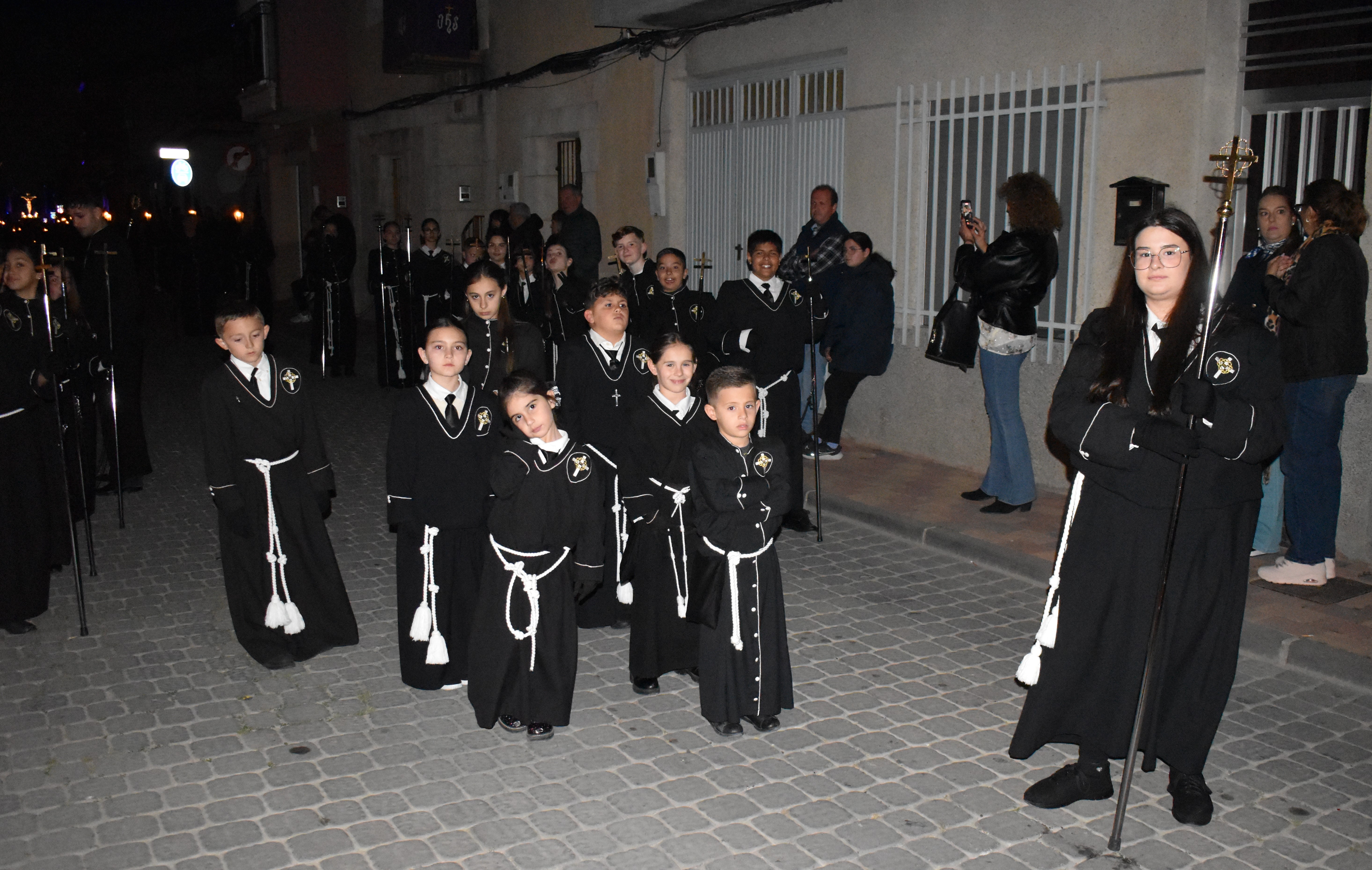 La Cofradía del Santísimo Cristo Crucificado llenó de túnicas negras las calles de Las Torres de Cotillas en la noche del Miércoles Santo. Y es que la procesión del Silencio volvió un año más a la Semana Santa torreña para teñir el municipio de luto, recogimiento y solemnidad.