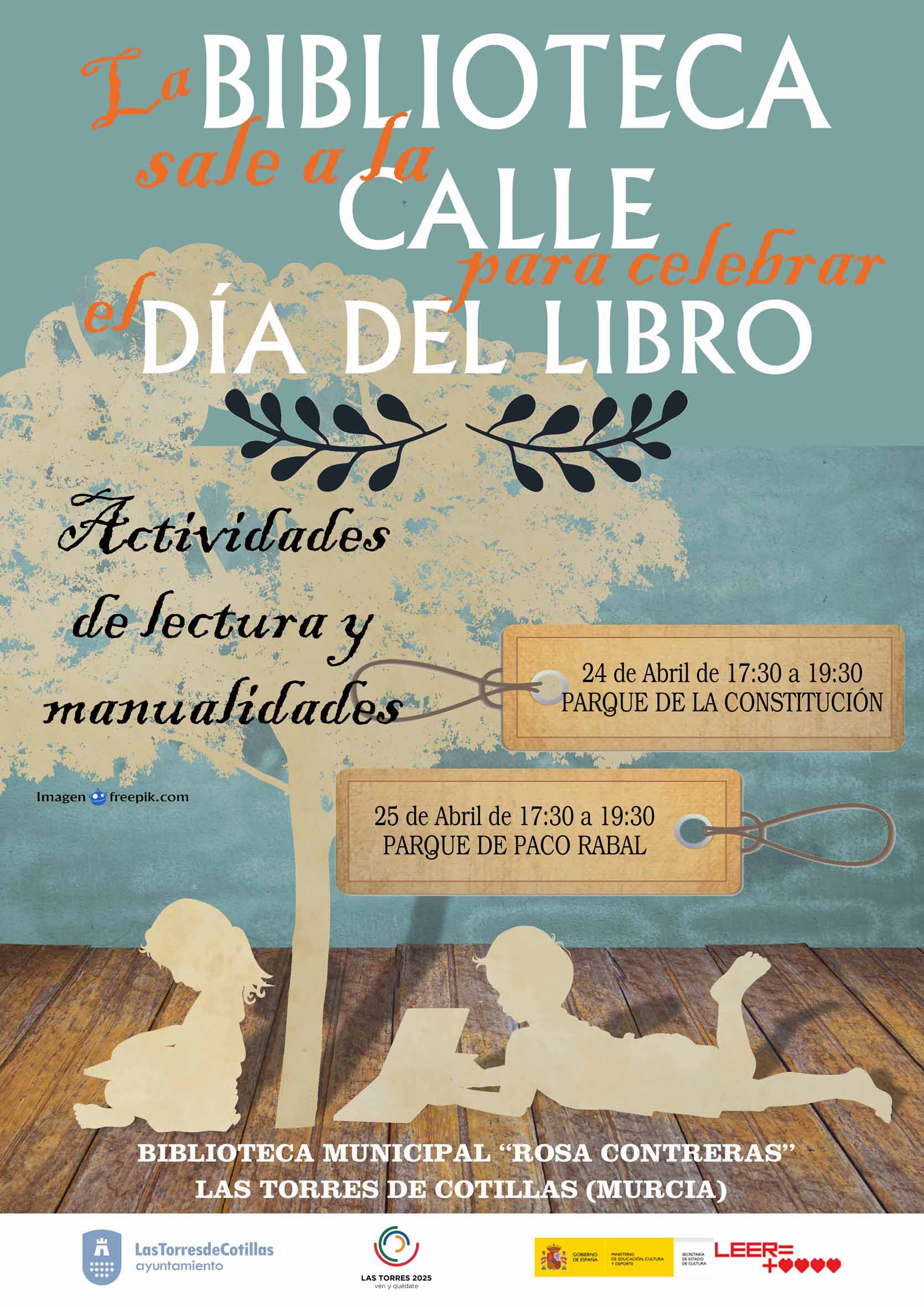 La biblioteca municipal Rosa Contreras de Las Torres de Cotillas saldrá a la calle para celebrar el día del libro, que se conmemora cada año el 23 de abril. Para ello realizará unas actividades de extensión bibliotecaria al aire libre para publicitar los servicios que ofrece, que estarán destinadas principalmente al público infantil.