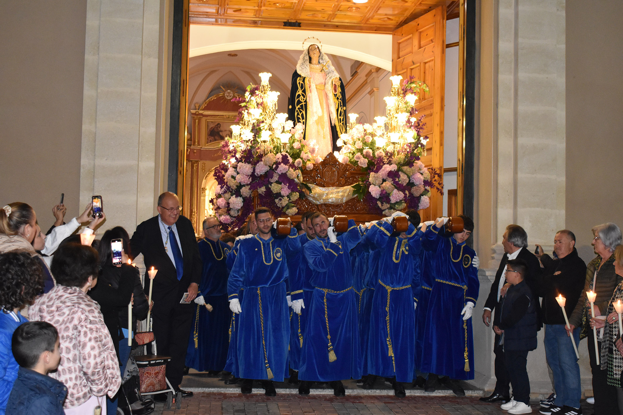 12/04/24 – El mal tiempo volvió a hacer de las suyas en la Semana Santa de Las Torres de Cotillas. Todo el mundo miraba al cielo en la noche de ayer 11 de abril, Viernes de Dolores, esperando que diera tregua para que la Dolorosa pudiera desfilar por las calles del municipio. En un principio parecía que iba a ser posible, ya que tras la misa en la iglesia de Nuestra Señora de la Salceda el desfile llegó a salir. Numerosos vecinos y devotos acompañaban a La Dolorosa en su recorrido, demostrando su fervor incluso bajo las primeras gotas.