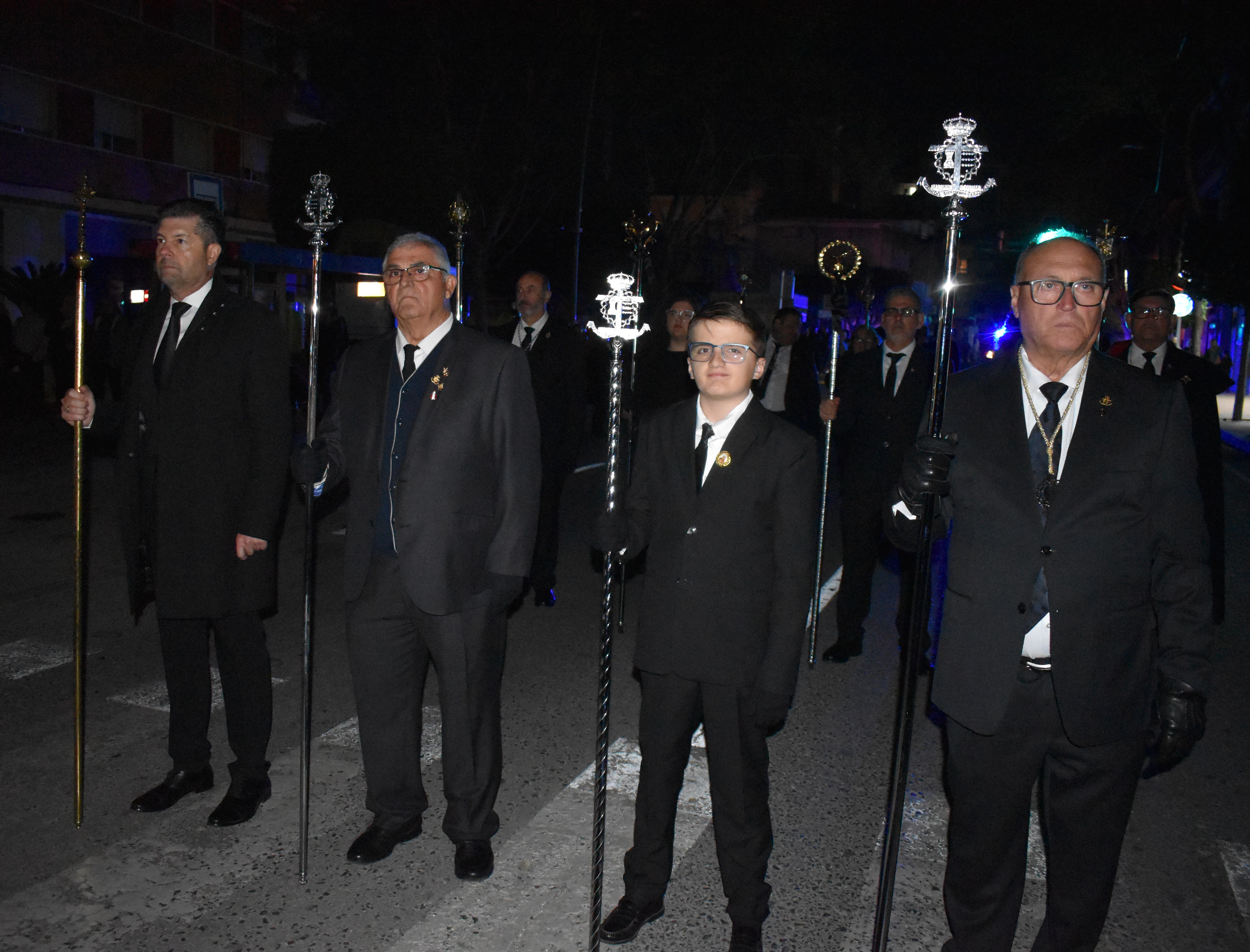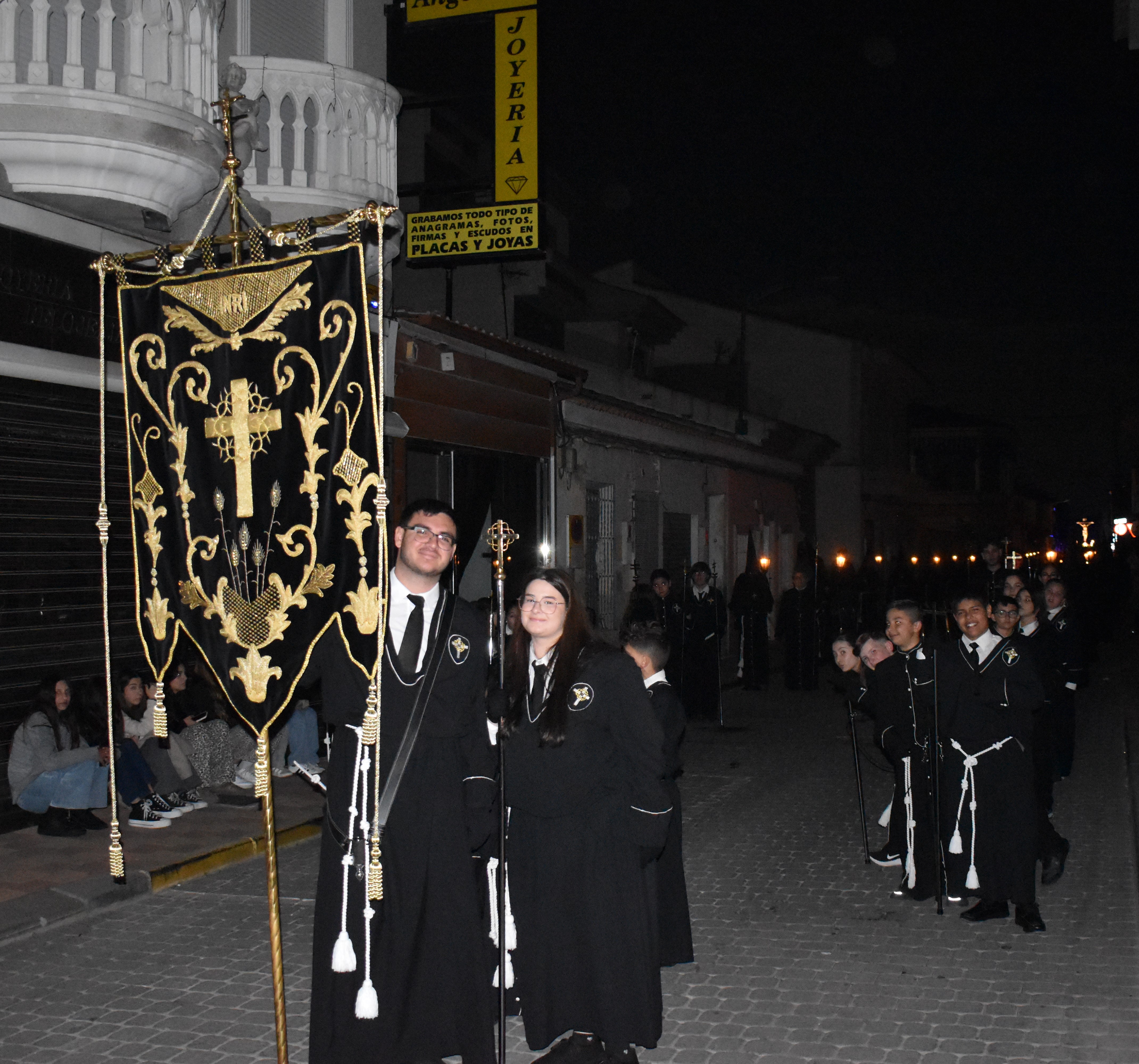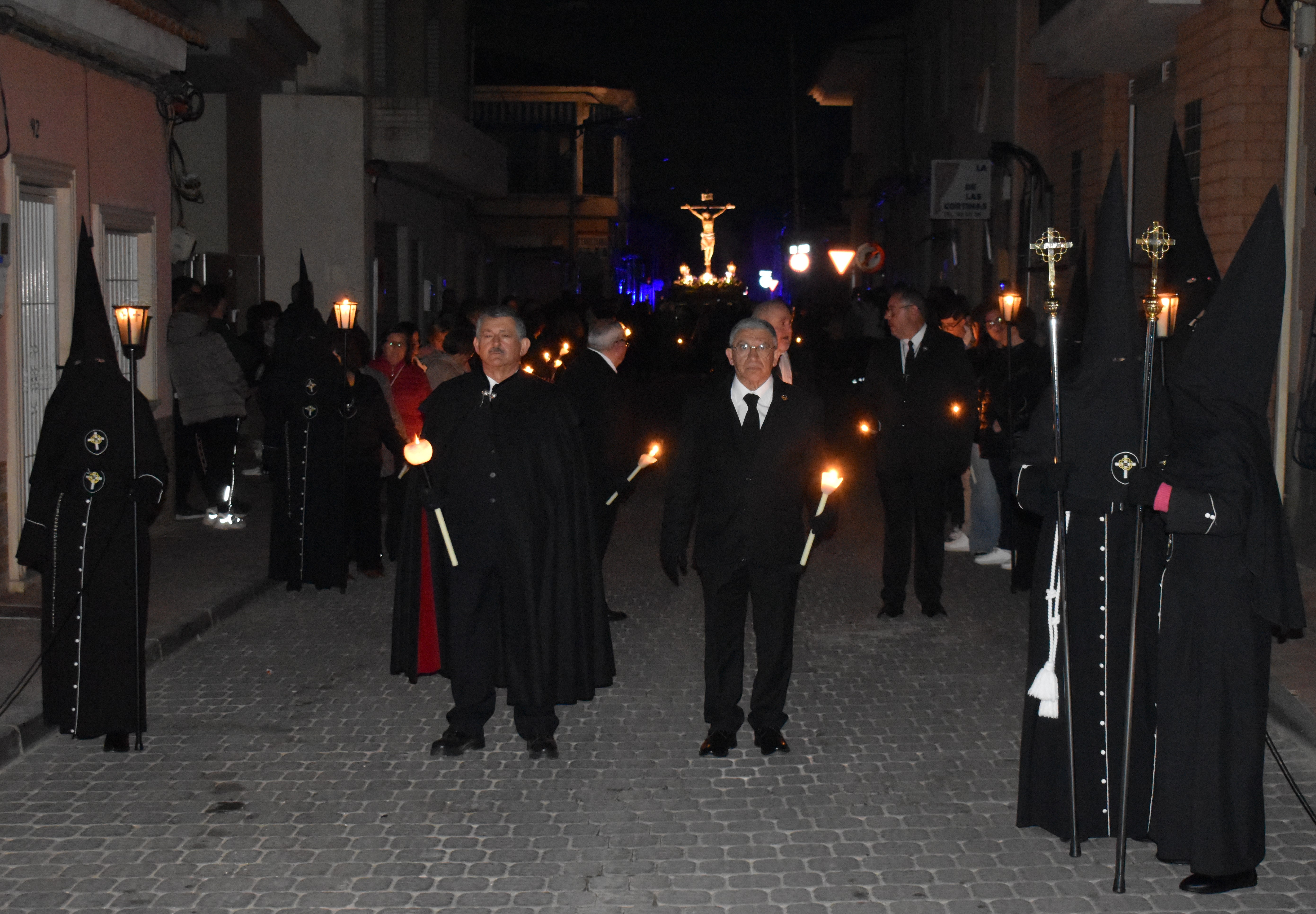 Como es tradición, a la salida de la procesión la campana de auroros Virgen del Rosario local rompió el silencio imperante para cantarle al Cristo. Después los ‘negros’ y los penitentes, al ritmo de la banda de la Cofradía, desfilaron sigilosamente por las calles torreñas.