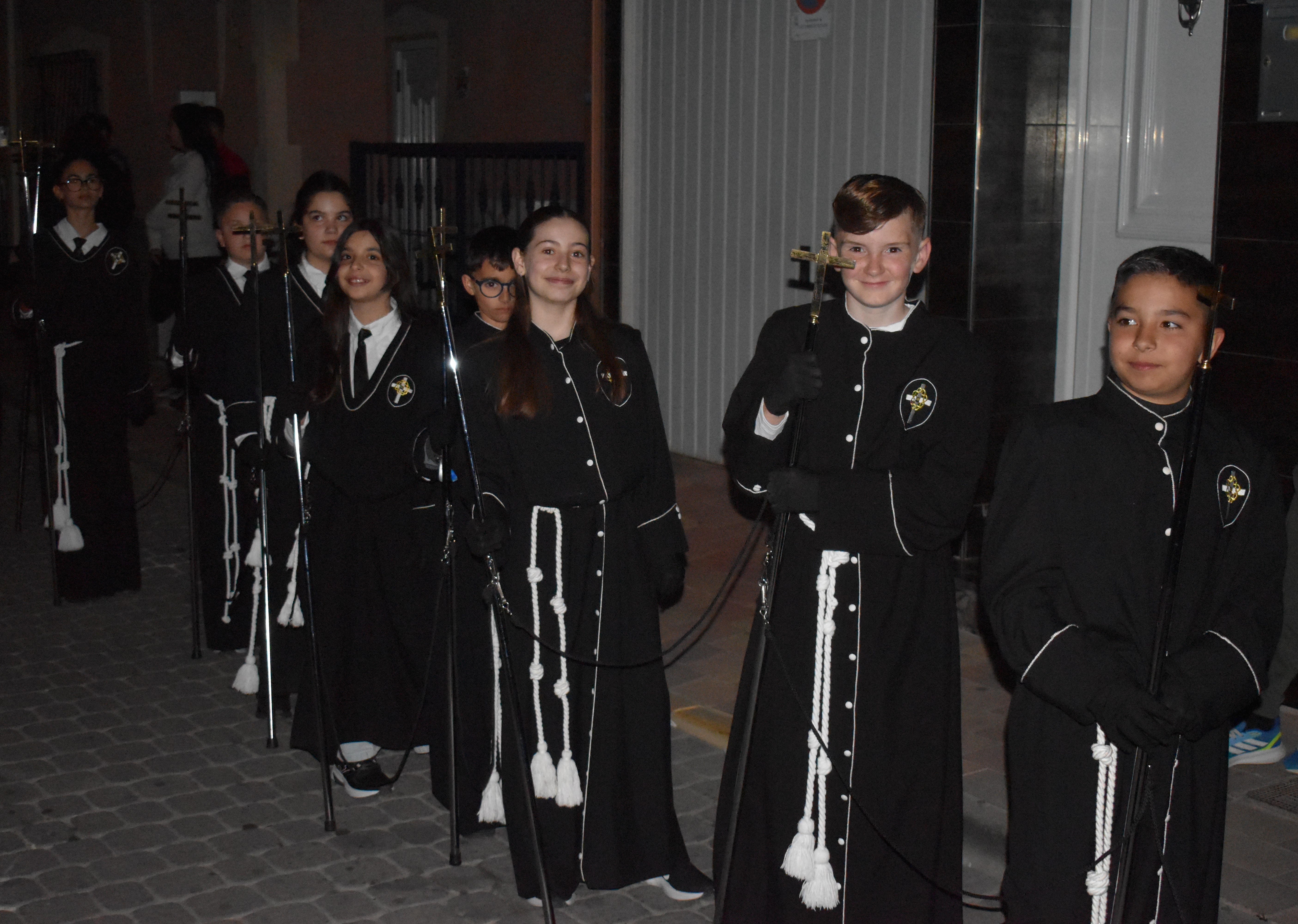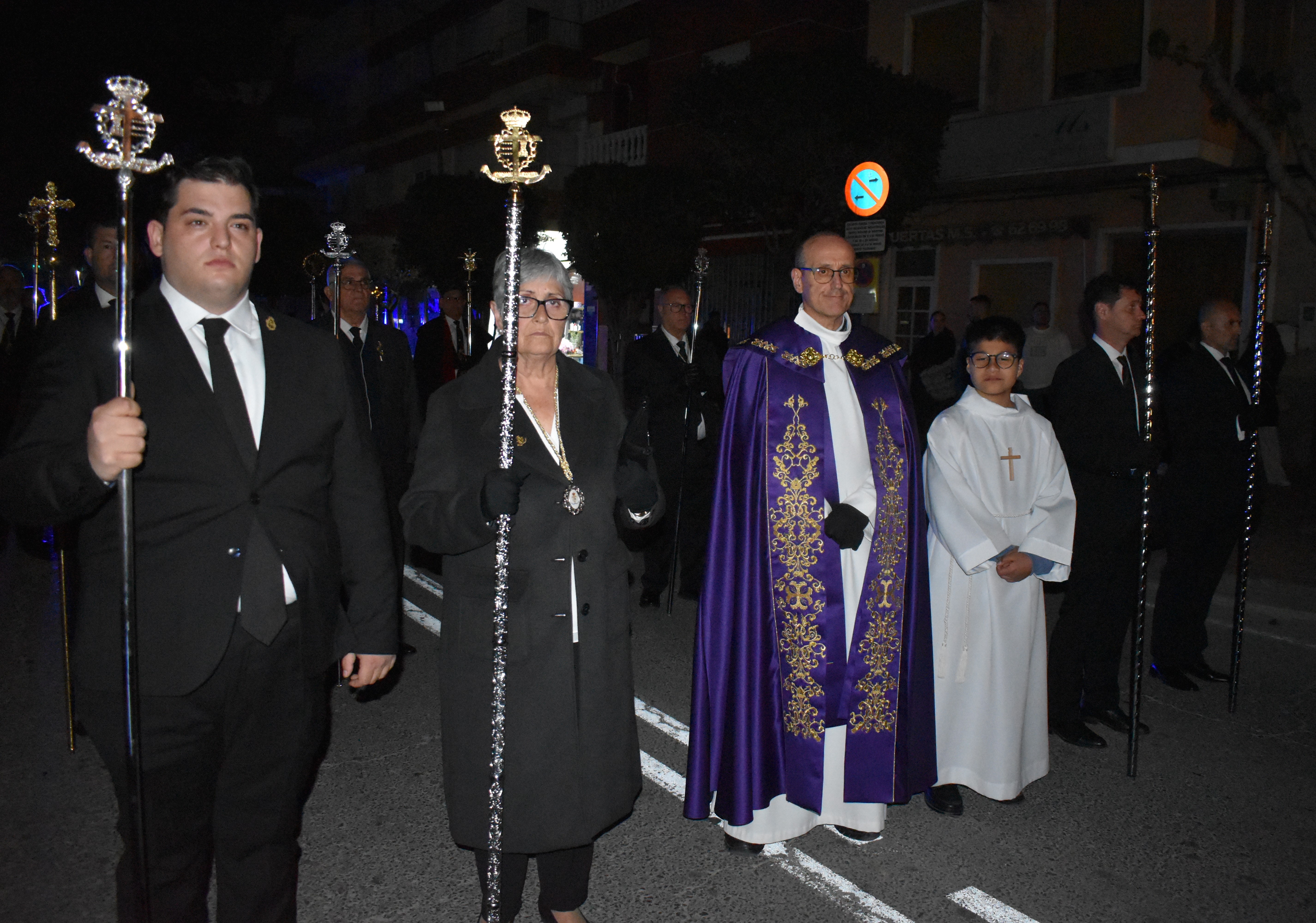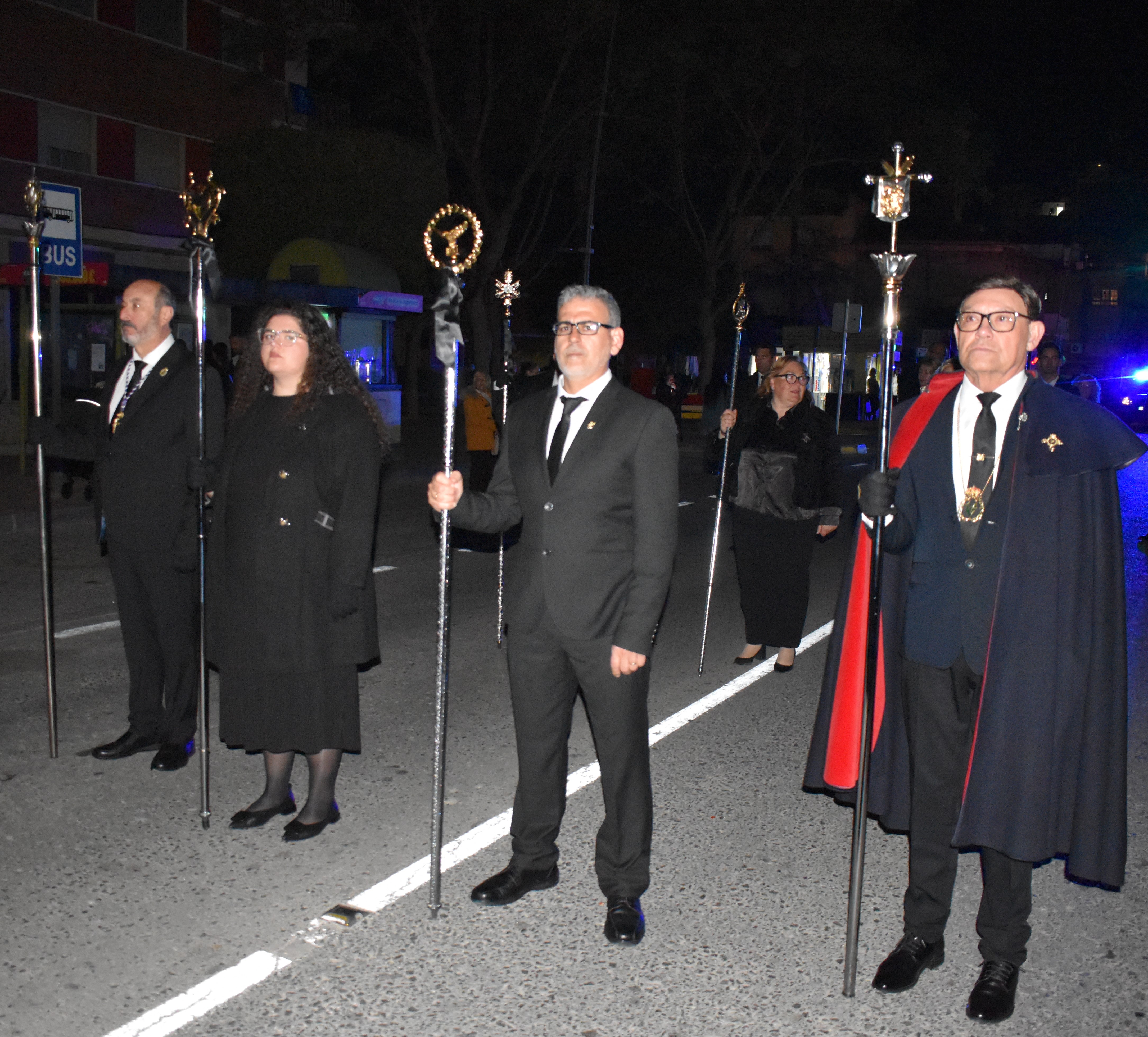 Como es tradición, a la salida de la procesión la campana de auroros Virgen del Rosario local rompió el silencio imperante para cantarle al Cristo. Después los ‘negros’ y los penitentes, al ritmo de la banda de la Cofradía, desfilaron sigilosamente por las calles torreñas.