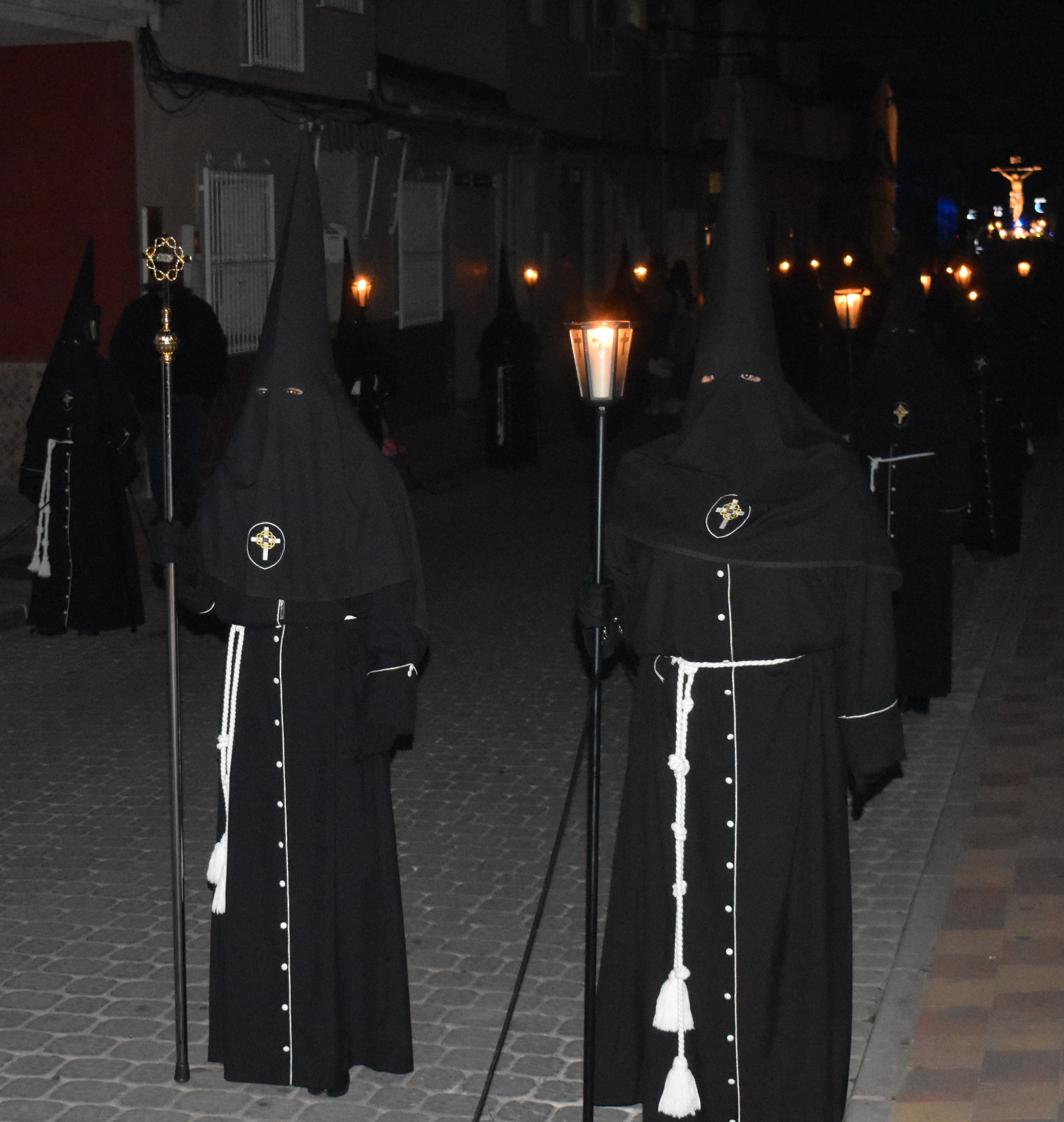La Cofradía del Santísimo Cristo Crucificado llenó de túnicas negras las calles de Las Torres de Cotillas en la noche del Miércoles Santo. Y es que la procesión del Silencio volvió un año más a la Semana Santa torreña para teñir el municipio de luto, recogimiento y solemnidad.