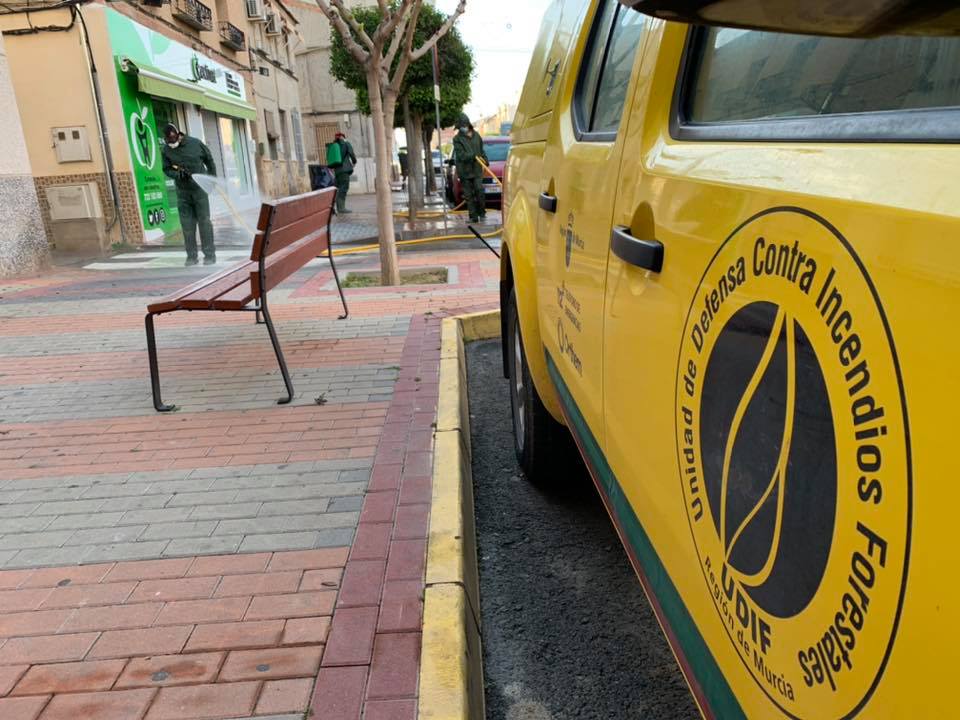 Las Brigadas Forestales de la Región de Murcia están colaborando en las labores de limpieza y desinfección de las zonas de mayor afluencia de personas de Las Torres de Cotillas, y diferentes calles del municipio y pedanías. Estos trabajos, que se realizan como medidas de prevención para evitar la propagación del Covid-19, se están desarrollando en espacios públicos anexos a servicios públicos, centros sanitarios, gasolineras, supermercados, bancos, comercios, farmacias...