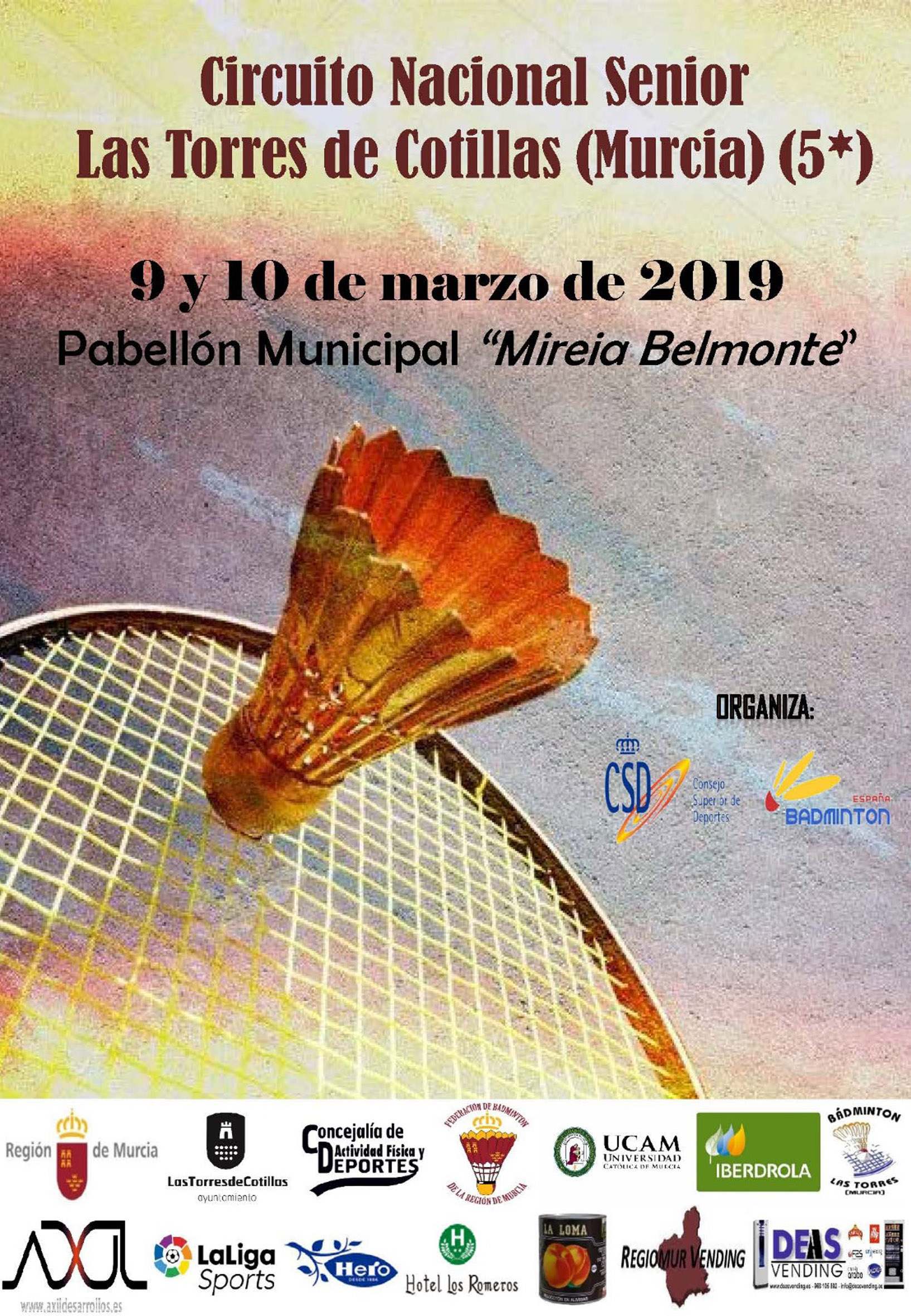 En este evento colaboran la Federación Bádminton Región de Murcia, la Dirección General de Deportes, la Universidad Católica San Antonio de Murcia (UCAM), Iberdrola, Bádmiton Las Torres, Axil Desarrollos, Hero, LaLiga Sports, Hero, Hotel Los Romeros, La Loma, Regiomur Vending y Deas Vending.
