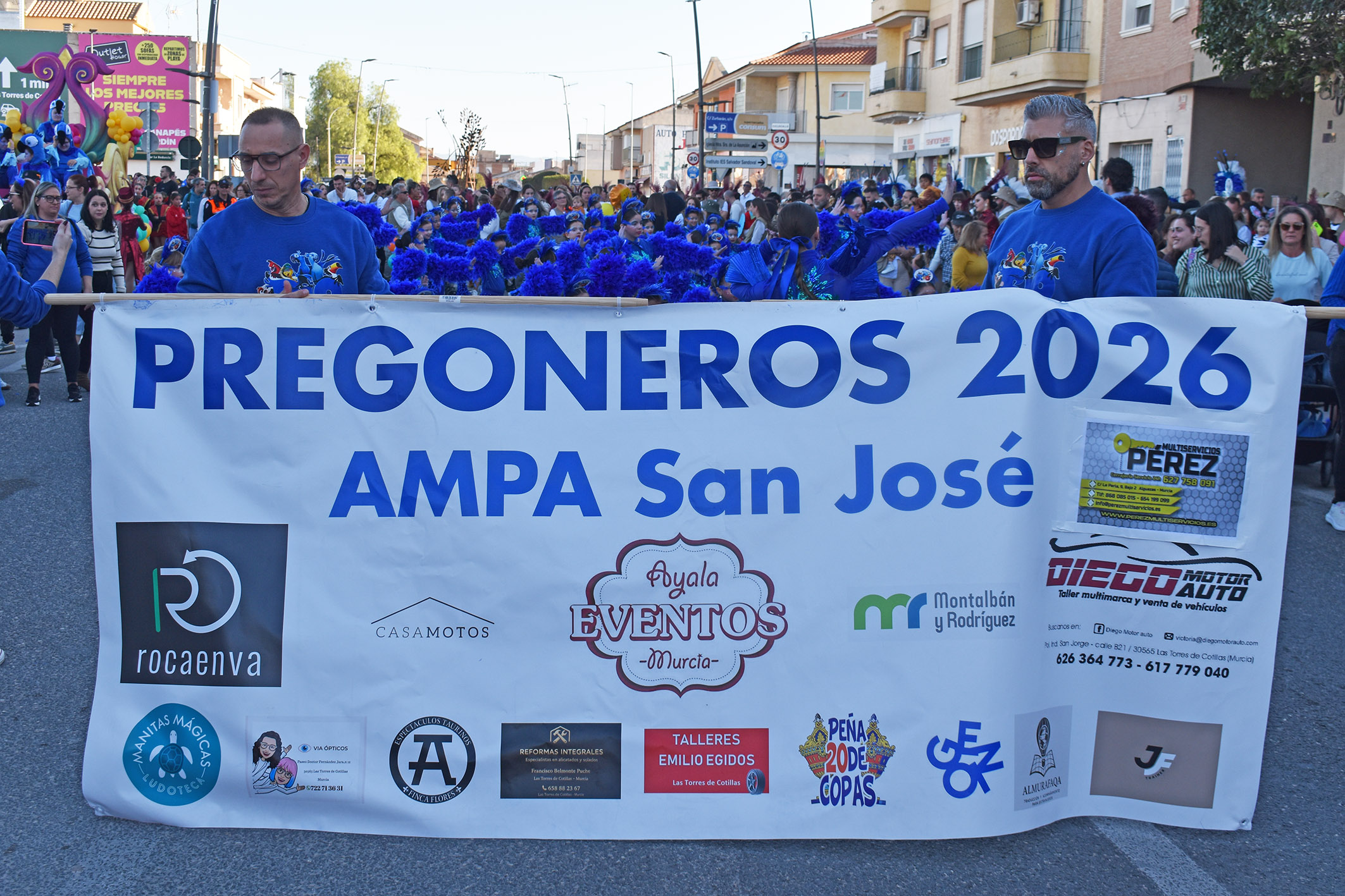 22/02/26 – Un total de dieciséis peñas, comparsas y carrozas aglutinando a más de mil personas pusieron ayer sábado 21 de febrero el broche final a los Carnavales 2026 de Las Torres de Cotillas. Lo hicieron en el tradicional desfile organizado por la Concejalía de Festejos, que unió la avenida Juan Carlos I a la explanada Maestro Ángel Palazón.