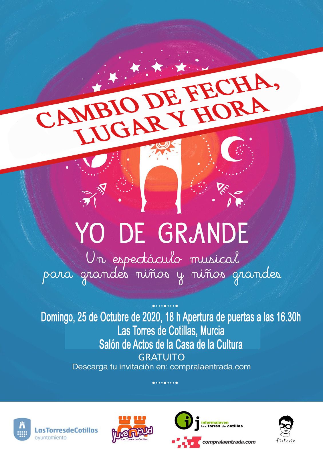 El espectáculo familiar "Yo de Grande", programado por la Concejalía de Juventud para este sábado 11 de septiembre, se aplaza al domingo 25 de octubre (18 horas), siempre y cuando la evolución de la situación sanitaria lo permita. También se cambia de lugar, pasando del auditorio municipal "Juan Baño" al salón de actos de la Casa de la Cultura "Pedro Serna".